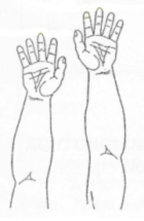 der sich in einer scheinbaren Verschiedenheit der Armlängen der linken und rechten Seite